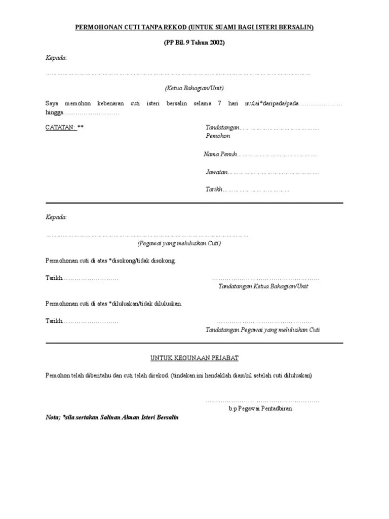 Pastinya perkhabaran ini menggembirakan ramai staf wanita syarikat perbankan tersebut. Permohonan cuti tanpa rekod (ctr) jabatan peguam negara a. Borang cuti tanpa rekod menduduki peperiksaan.pdf. Cuti isteri bersalin selama 7 hari diberi kepada sang suami mengikut pekeliling perkhidmatan bil. 9 tahun 2002 mulai 1 januari 2003.