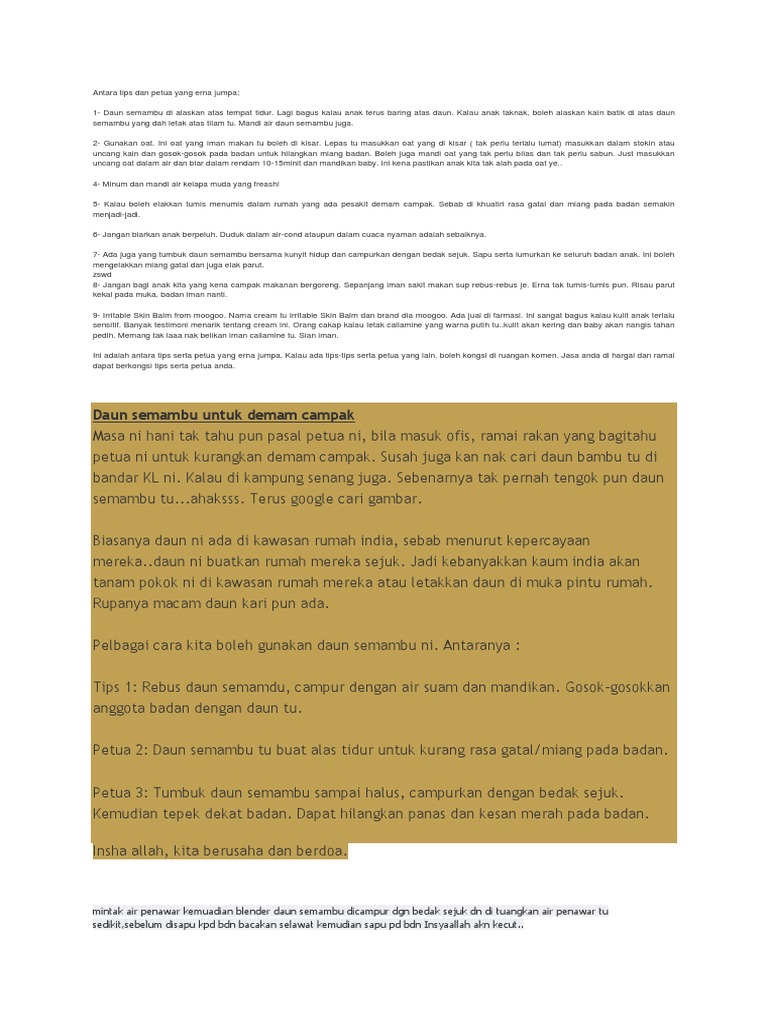 Sila Amalkan Petua Berkesan Ini Selepas Anak Habis Demam Campak Untuk Hilangkan Parut Kartel Dakwah from www.karteldakwah.com Sapukan di tempat berparut dan biarkan kering. === tapi sebelum itu virus hfmd & penyelesaiannya. Ulangi selama tiga hari atau sehingga parut hilang. Untuk menghilangkannya, cubalah petua di bawah ini: Untuk mengelakkan gatal pada badan pula, gunalah daun semambu dari pokok semambu dengan meletakkan daun itu dibawah cadar dan bantal sebagai alas tidur. Demam campak ini mungkin boleh dikatakan sejenis dengan penyakit mizel @ chicken pork. Sekiranya berminat untuk dapatkan daun semambu liar yang 100% tulen, khasiat terus meresap ke dasar kulit tanpa di halang oleh sabun. Batang pokok semambu atau neem agak besar dan berkulit tebal.