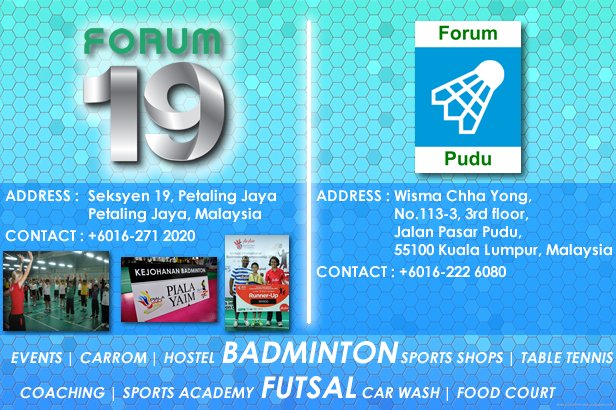 It also houses an internet cafe, futsal court, cash washing, convenient shop and indoor parking space. Other prized souvenir includes tournament jersey of dauk lee chong wei, taufik hidayat, peter gade, saina nehwal, and zhang jiewen, all autographed by the players themselves. Forum 19 is a sports center offering badminton & futsal courts and ping pong tables. A court may be marked out for singles only. The badminton court is 13.4m long and 6.1m wide.