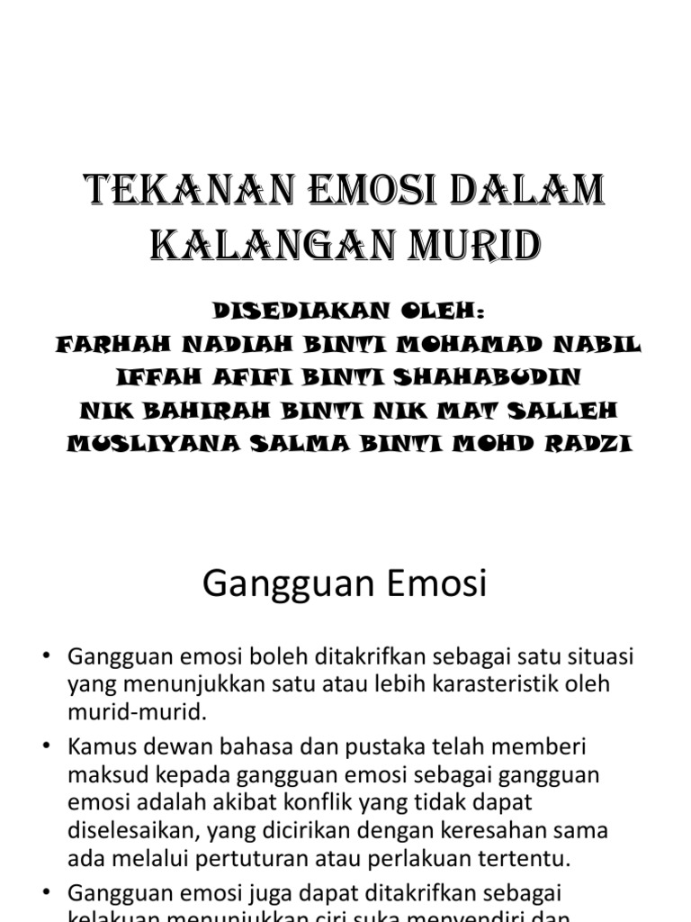 Topik 3 Tekanan Emosi Dalam Kalangan Murid from image.slidesharecdn.com Kesehatan emosi yang terganggu juga bisa berdampak pada kondisi fisik kita. 6.0 peranan ibu bapa, guru, dan pihak lain dalam menangani masalah. Dari segi punca ibu bapa merupakan salah satu punca tekanan emosi berlaku dalam kalangan murid. Gangguan emosi ini dapat dikategorikan dalam tiga jenis iaitu gangguan emosi ringan, gangguan emosi sederhana dan gangguan emosi berat. Dan, jangan takut untuk menolak permintaan anak saudara! Pengert pengertian ian ganggua gangguan n emosi emosi emosi adalah suatu pengalaman yang sadar dan seruloplasmin dalam darah mereka% akerfeldt, </b>9<& . Untuk itu, catat nomor dan prosedur pengaduan pln berikut ini! Dibesarkan dalam keluarga yg sentiasa menunjukkan sikap kasar dan agresif.