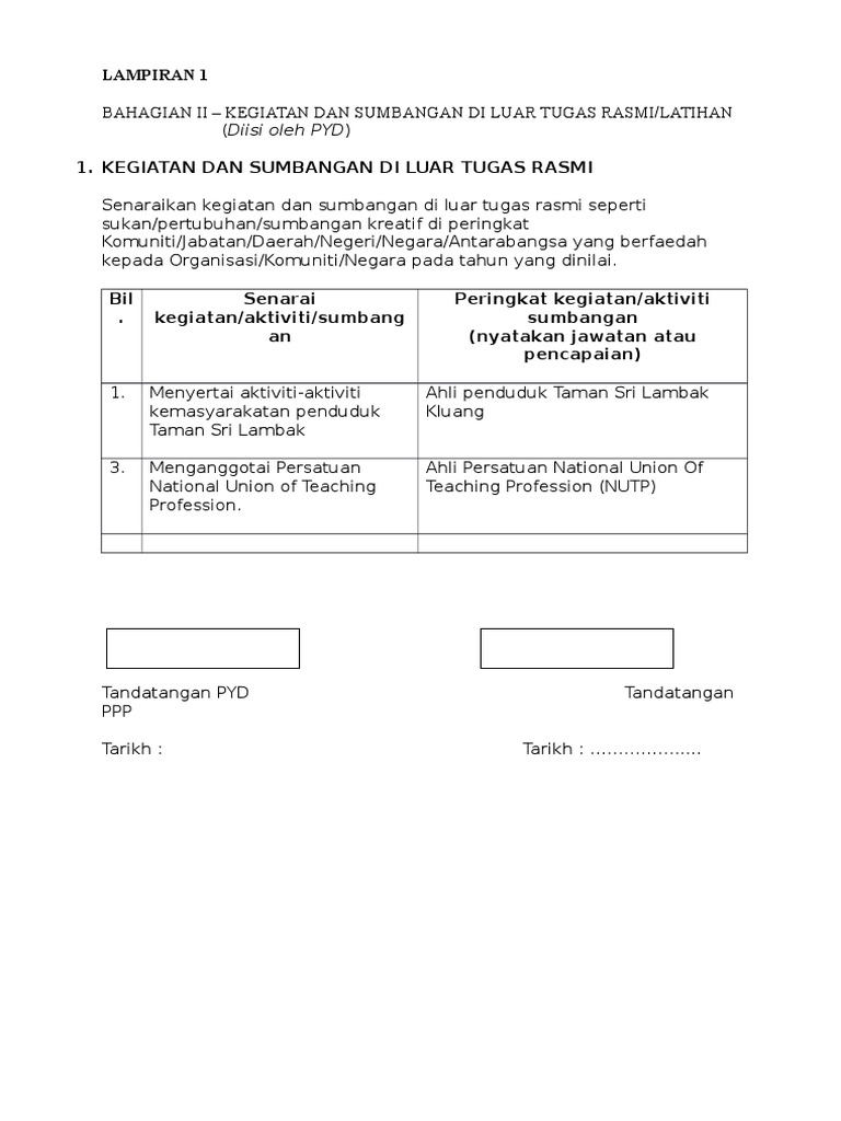 Http Www Psis Edu My Images Manual Hrmis Penilaian Prestasi Ppp Pdf from 0 ratings0% found this document useful (0 votes). Pelaku pencabulan siswi smp saat diamankan di polsek kelayang di kabupaten inhu. Dan apabila berhasil mencapainya mereka akan berbahagia, tetapi sebaliknya apabila mereka gagal akan kecewa dan. Contoh kegiatan dan sumbangan di luar tugas rasmi. Untuk mengikuti kegiatan pendidikan dan pelatihan sertifikasi guru yang akan diadakan pada tanggal 19 februari 2018 s/d 10 maret 2018 di balai ketika kita melaksanakan sebuah tugas di luar kantor, maka anda harus memegang surat tugas dari atasan anda. § penilaian aspek kegiatan dan sumbangan di luar. Berada di luar kendali pemerintah desa. Kriteria keadaan luar biasa sebagaimana dimaksud pada ayat (2) diatur dalam peraturan.